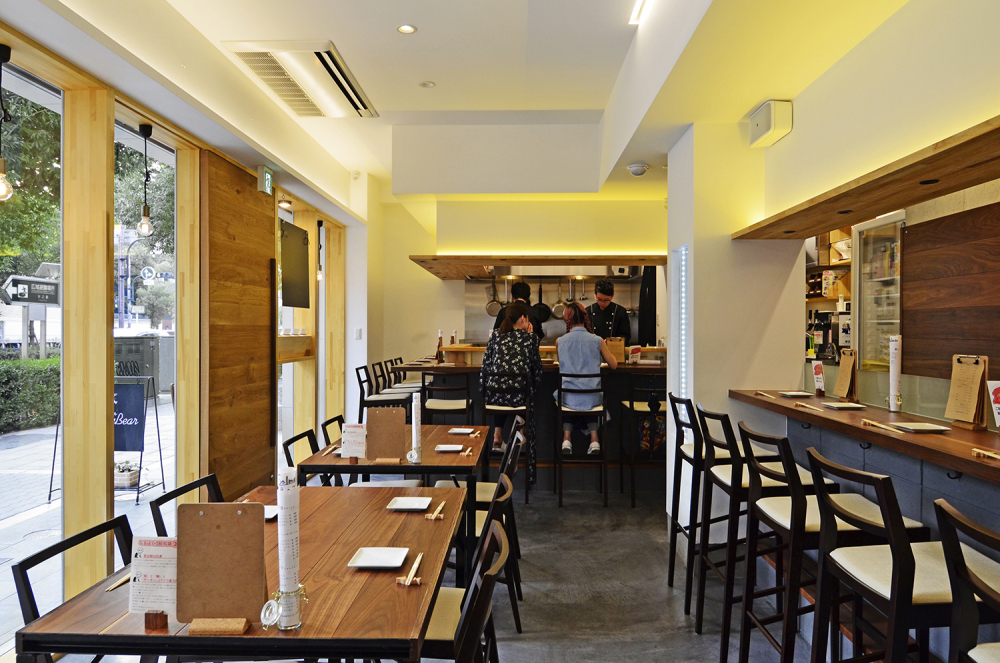 計画地は福島飲食街と中之島再開発地区の中間に位置する大通り沿い。多種多様な人が行き交う立地の飲食店として、幅広い利用シーンで各々が居心地良く食事ができる”使い勝手の良い空間”が良いのではないかと考えました。そこで〈料理人を囲むL型カウンター〉と〈バーのようなI型カウンター〉、〈多人数用テーブル席〉を設け、各々の利用シーンに合った席を選択できると共に、希望席の空き待ちの間に他の席で食事ができるようにしています。